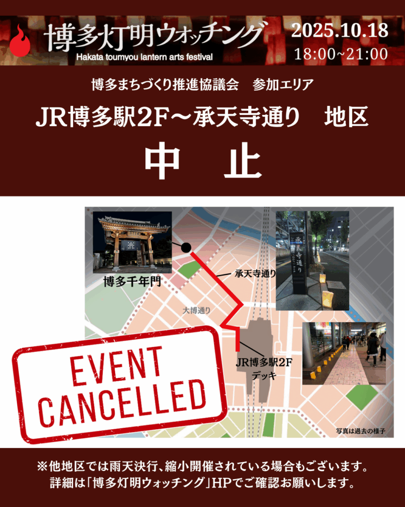 JR博多駅2F〜承天寺通りの灯明ウォッチングは、天候不良(雨天)のため事前準備が行えず、やむなく開催を中止することとなりました。開催を楽しみにされていた皆様、申し訳ございません。