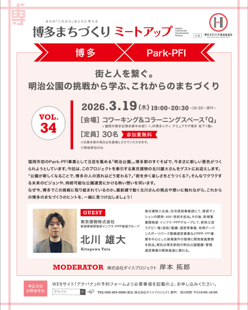博多まちづくり推進協議会が3/19(木)に開催する「博多まちづくりミートアップ」は、福岡市初のPark-PFI事業として注目を集める「明治公園」のプロジェクトを牽引する東京建物の北川雄大さんをゲストにお迎えします!
