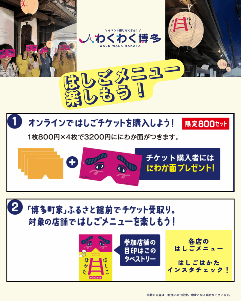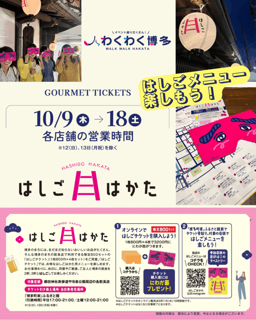 「わくわく博多」は、数ある博多の歴史・文化・食の魅力を発掘し、博多に訪れる方々だけでなく、周辺地域で暮らし、働く方々にも、改めて博多の魅力を感じられる機会を創出するためのイベントです!