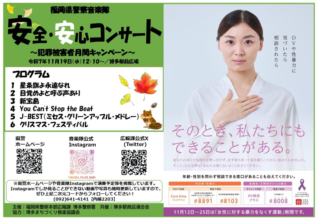 Tweet 2025 Nov 12 地域や他組織との連携 11月19日(水)「安全・安心コンサート」開催♪ 11月19日(水)博多駅 博多口駅前広場にて、福岡県警察音楽隊の皆さまによる「安全・安心コンサート」が12:10より開催されます。皆さまのお越しをお待ちしております。