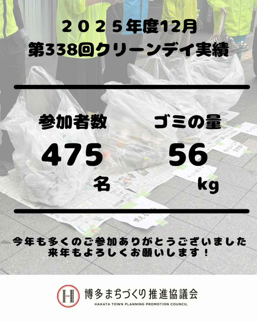 本日12/18(木)、第338回クリーンデイを実施し、475名の参加者とともに年末が近づいてきた博多のまちを清掃し、56㎏のゴミを拾いました。ご参加いただいた皆さま、ありがとうございました。今日が2025年最後のクリーンデイでした。今年も多数の皆さまにご参加いただき、本当にありがとうございました!来年もよろしくお願いします♪
