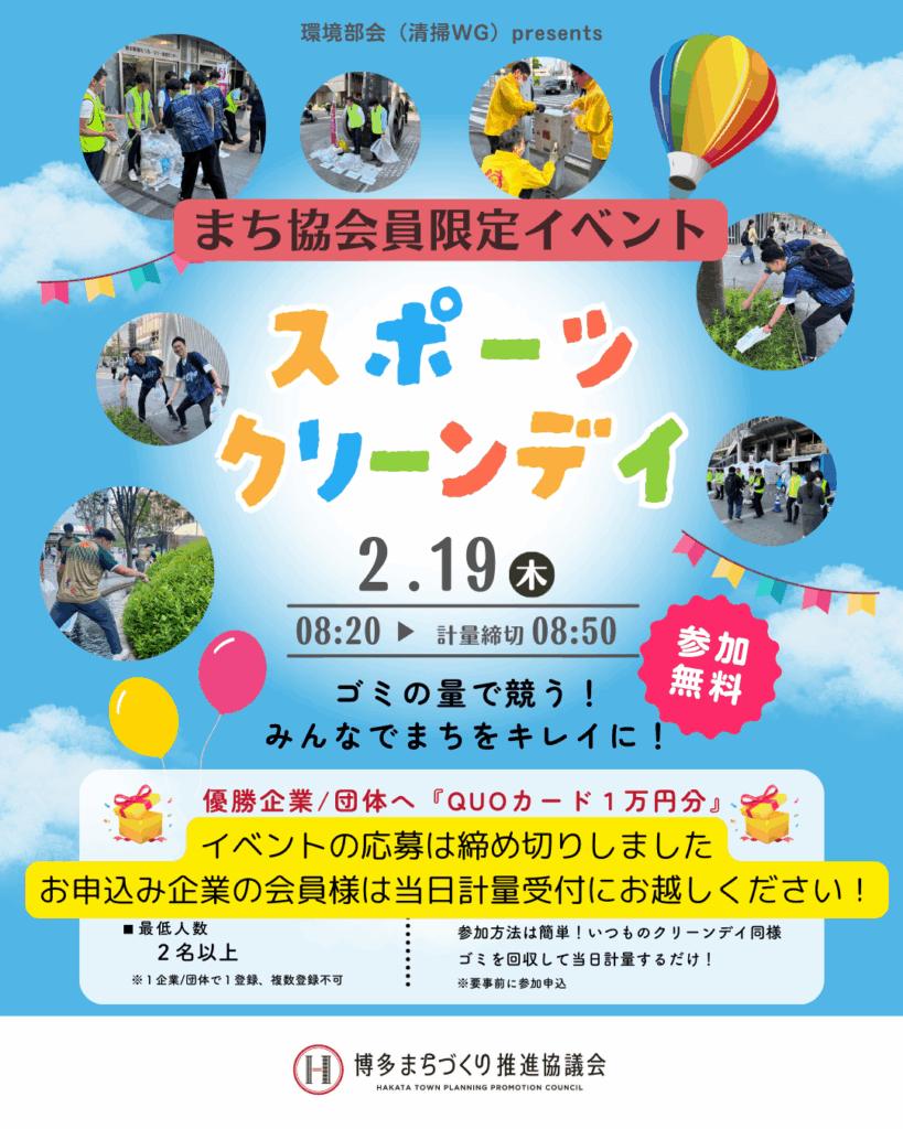 明日2月18日(木)「第340回クリーンデイ」は、予定通り開催します。 皆さまのご参加をお待ちしております。明日は、まち協会員限定イベント「スポーツクリーンデイ」を同時開催します!お申込み企業の会員さまは、ゴミ計量受付にて会員企業名を申告してください。たくさんゴミを拾って、博多のまちを綺麗にしましょう♪